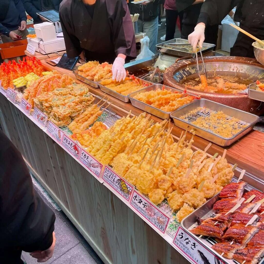เสน่ห์อย่างหนึ่งของที่นี่คือการเดินกินและหาของอร่อยทานตามร้านแผงลอย เมนูยอดนิยมได้แก่ซูชิ ข้าวหน้าปลาดิบ อาหารทะเลเสียบไม้ หรือถ้าอยากสัมผัสความเป็นโอซาก้าก็มีร้านทาโกะยากิและโอโคโนมิยากิเปิดขายเช่นกัน