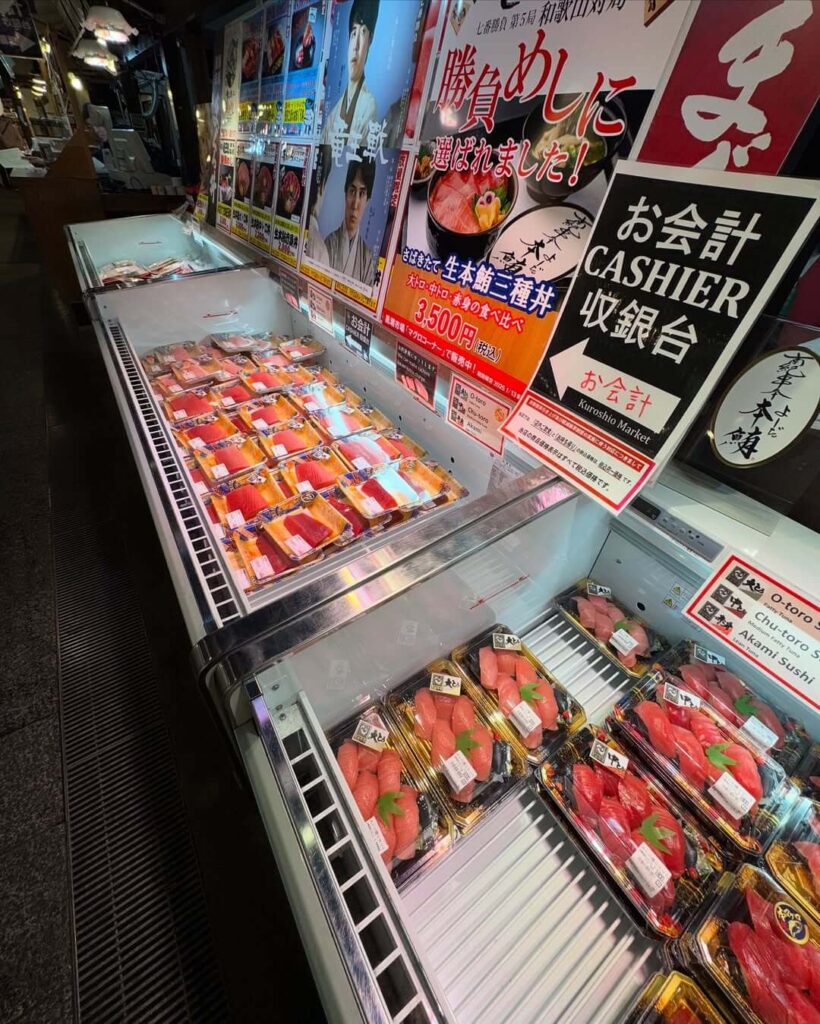 แน่นอนว่าเมนูที่ห้ามพลาดคือ ซูชิและข้าวหน้าปลามากุโร่ดิบ ที่ได้จากการแล่ปลามากุโร่สดๆ ในการแสดง นอกจากอาหารทะเลสดยังมีซูชิ ซาชิมิ และอาหารทะเลแปรรูปอื่นๆ ให้ได้เลือกซื้อเลือกรับประทาน ใครที่ยังกินอาหารทะเลจากโอซาก้าไม่จุใจก็นั่งรถไฟมาที่วาคายามะได้เลย